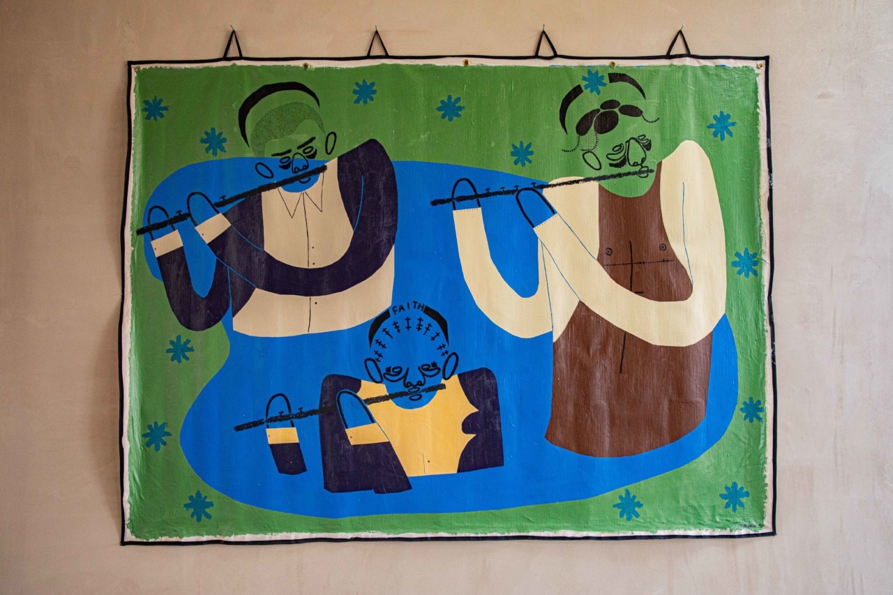 The inspiration is similar to that of ‘The Musician.’ In my research of Mami Wata I watched a few clips of people who worshipped her and there was music and celebration. The painting depicts three believers emerging from the water, playing flutes, drawing you in closer to hear. And similarly to Mami Wata who varies in gender and form, I imagined the believers in this particular painting to be trans characters, which is a projection of my own interpretation of her story.