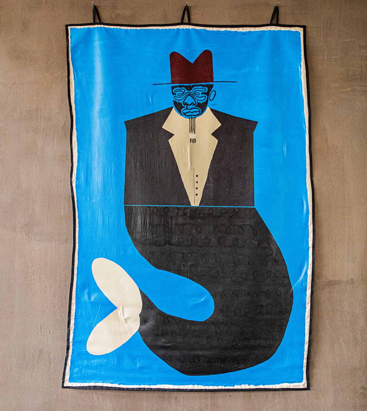 I became interested in mermaids and specifically Mami Wata. I read about stories of everyday people who interacted with her and this painting shows a fictional character ‘The Musician’, suited like one of those early Jazz musicians, who becomes part mermaid after meeting Mami Wata herself. The character in this painting is the same Musician character in the collaborative film I made with Ronan Mckenzie titled WATA.