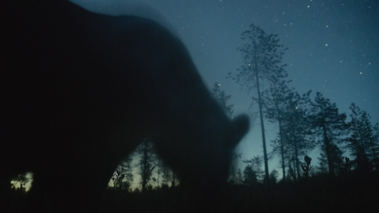 The silhouette of a bear leans down in the midst of a forest. The night sky is bright with stars.